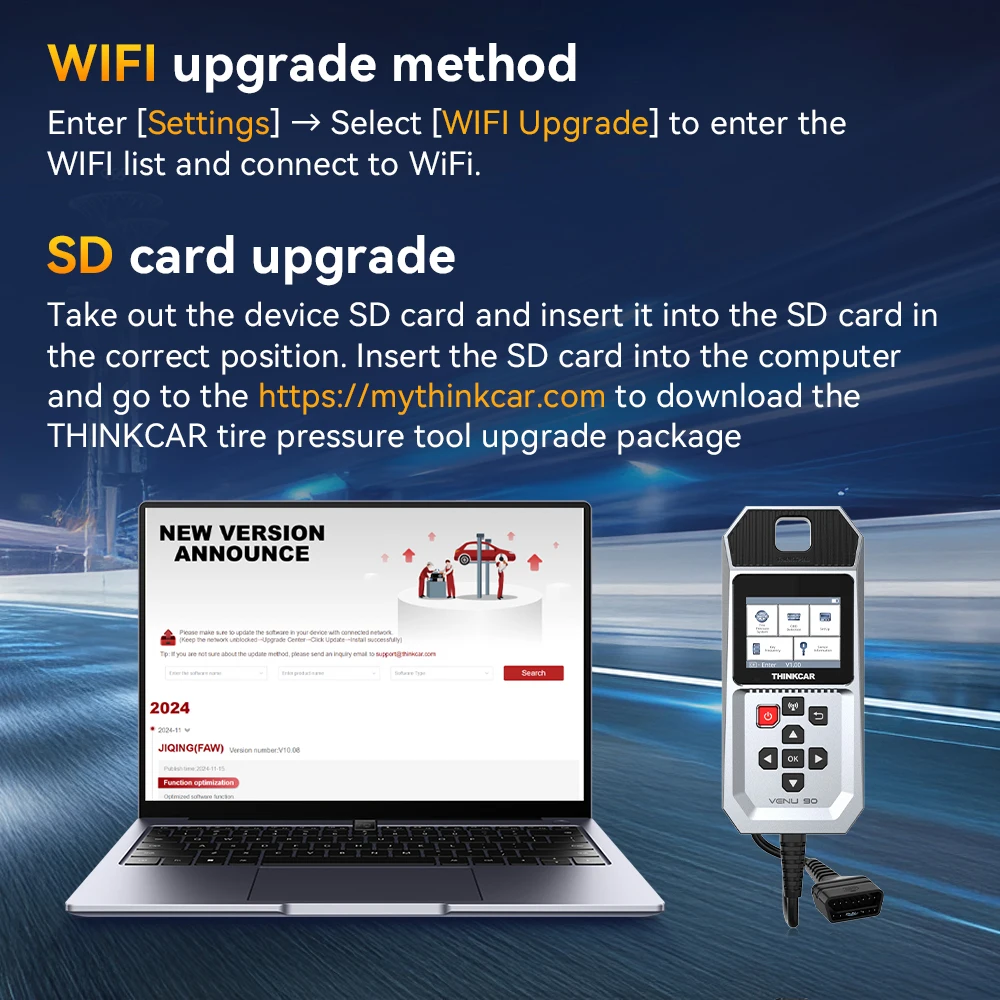 It supports activation of 315MHz and 433MHz tire pressure sensors, can perform tire pressure diagnosis on thousands of models, and can wirelessly program THINKCAR Venu 5 Sensors, or S1 S2 S3 tire pressure sensors. It's support lifetime free wireless Wifi update, can use independentely, no need APP or work with other tools. Morever, it's not only a TPMS tire pressure tool, but also a car OBD2 diagnostic tool with full obd2 function.