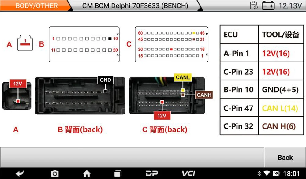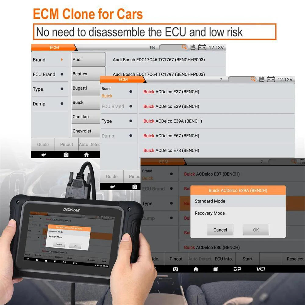 Don’t use the tablet charing cable as your power supply !!! For BENCH & BOOT (workbench) operation, please use a reliable high-power DC regulated power supply (current not less than 5A) to power the ECU. OBDSTAR’s standard power adapter (current 2A) is only used for device charging and is not recommended for ECU.