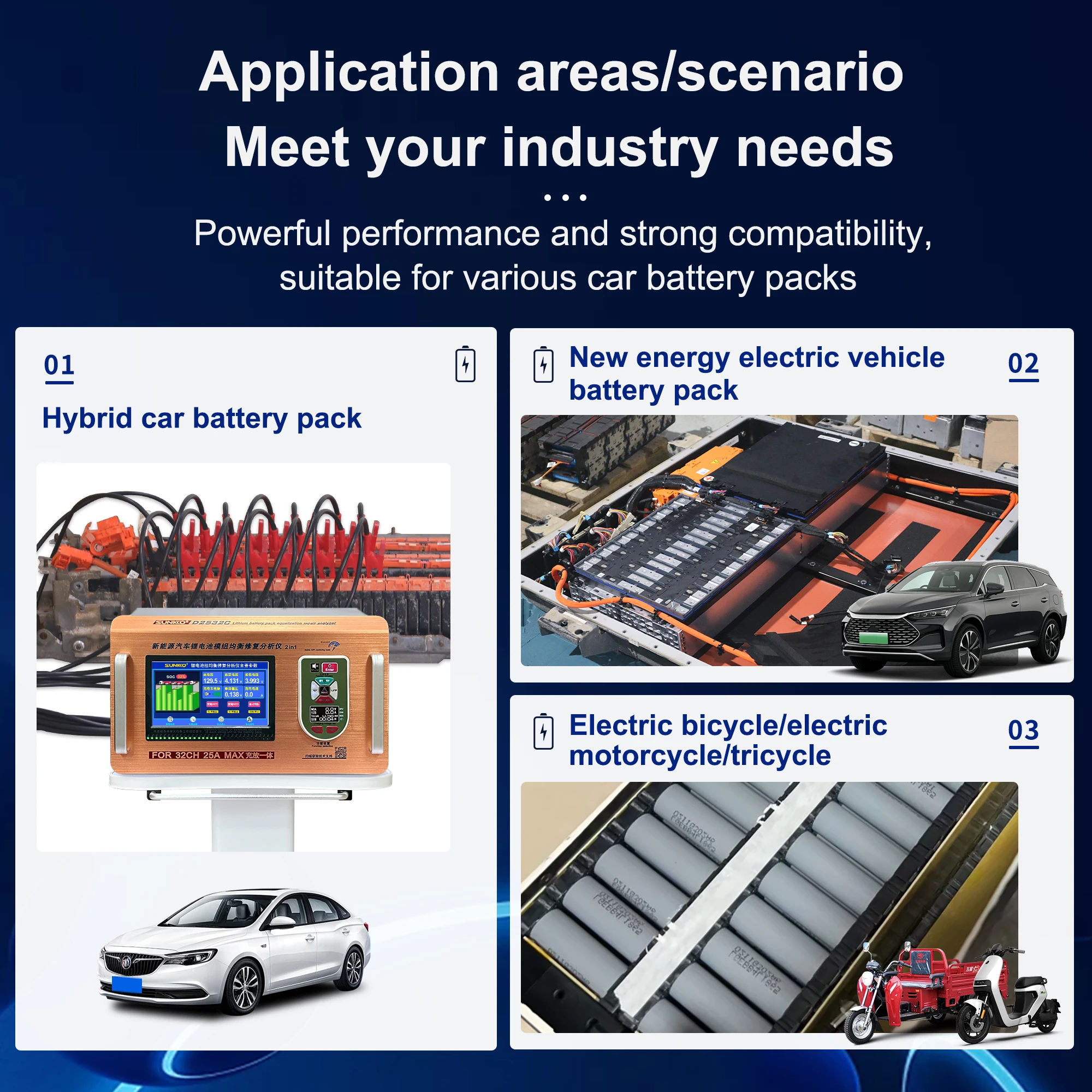 It is suitable for major scientific research institutions, lithium battery dealers, battery pack manufacturers and battery protection system manufacturers to detect and analyze the voltage of multiple batteries, and to perform maintenance services on power battery packs such as new energy vehicles and energy storage systems.