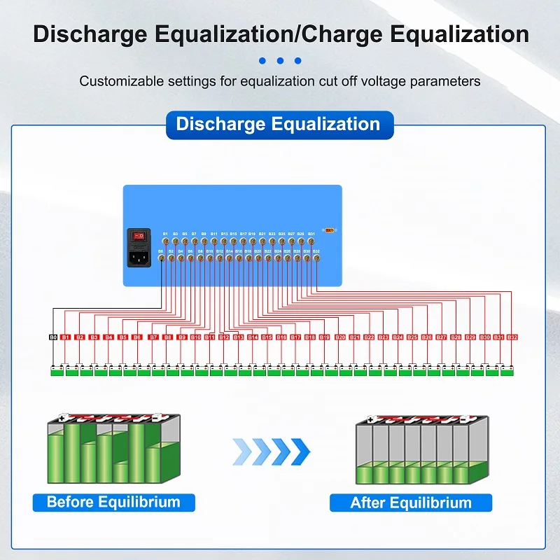 9. Discharge equalization can select continuous discharge equalization mode or pulse discharge equalization mode according to the aging degree of the battery pack and the equalization requirements.
